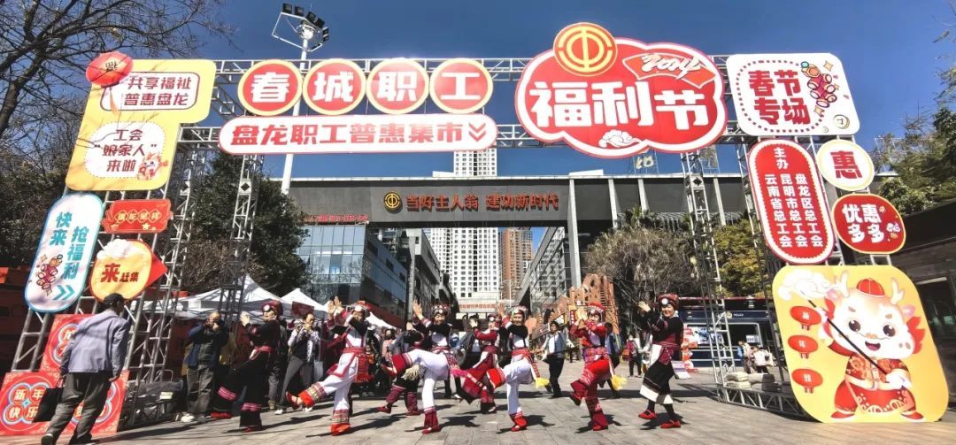 昆明市工人文化宮在云南機(jī)床廠舊址新建,功能設(shè)施齊全,文體活動豐富,成為昆明市廣大職工的學(xué)校和樂園。2024年2月4日,云南省總工會、昆明市總工會、盤龍區(qū)總工會聯(lián)合舉辦“職工普惠集市”活動,少數(shù)民族職工在集市上載歌載舞。