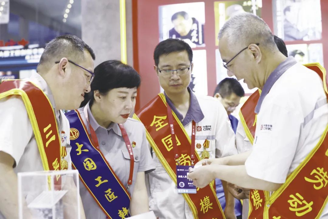 2023年7月,北京,第二屆大國工匠創(chuàng)新交流大會山西展區(qū),幾位參展勞模工匠就創(chuàng)新成果展開激烈討論,交流創(chuàng)新體會。