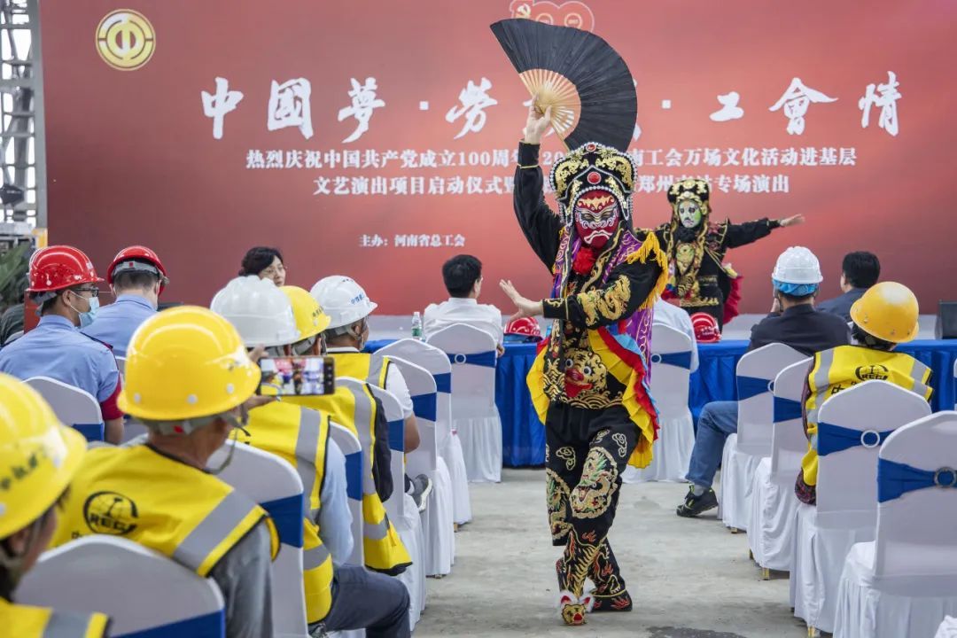 2021年5月17日,中鐵建工集團鄭州南站項目一線,“中國夢·勞動美·工會情”2021年河南工會萬場文化活動進基層活動啟動。豫劇表演藝術(shù)家、國家一級演員張海龍等為建設(shè)者們帶來精彩演出。