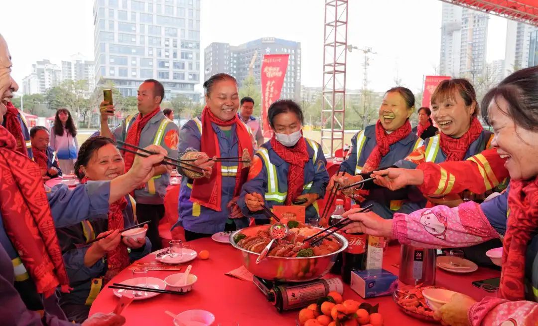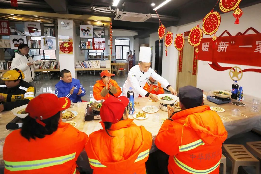 2024年2月2日,農(nóng)歷小年,湖北武漢武昌區(qū)中華路街都府堤工會驛站,外賣騎手、快遞小哥、環(huán)衛(wèi)工人等同吃團圓飯,工會特邀荊楚工匠、烹飪大師郭方斌掌勺烹制?!皟晒?jié)”期間湖北省工會籌集超2.1億元資金,為廣大勞動者送溫暖送慰問。