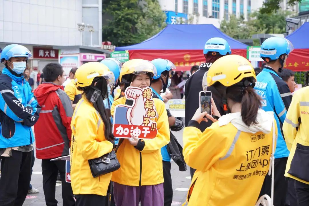 2023年7月5日,云南省昆明市新就業(yè)形態(tài)領(lǐng)域勞動競賽啟動儀式現(xiàn)場,外賣員們互相合影留念。