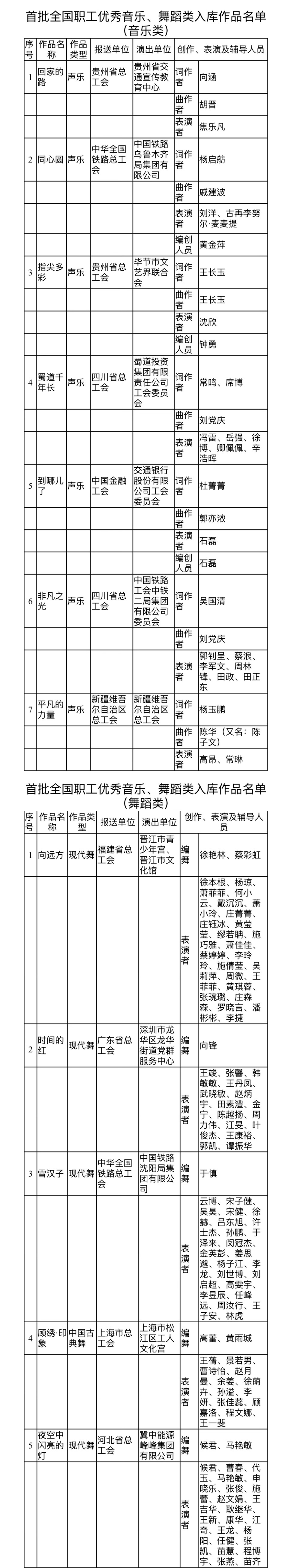 附:首批全國職工優(yōu)秀音樂、舞蹈類入庫作品名單