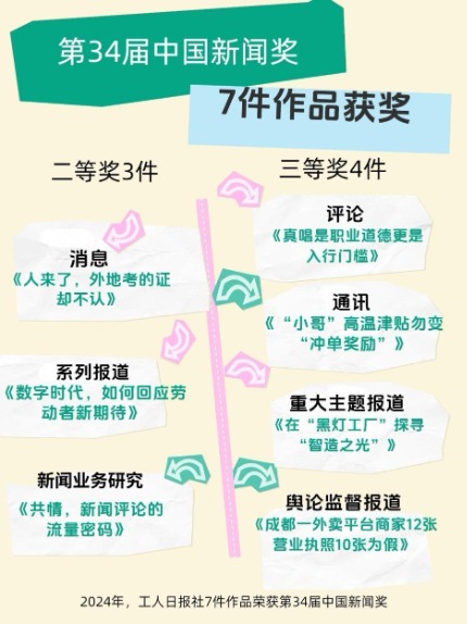 2024年,工人日報社7件新聞作品榮獲第34屆中國新聞獎,其中二等獎3件、三等獎4件。另有多件作品獲得“中國正能量網(wǎng)絡(luò)精品”“報業(yè)媒體助力全民閱讀優(yōu)秀案例”“林草好新聞”“鐵路好新聞”“銀行業(yè)好新聞”“水利好新聞”等榮譽。