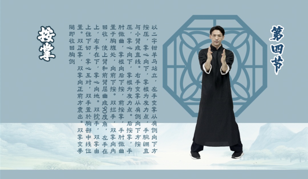 按掌是詠春拳中的一個(gè)基本手法,通過(guò)以氣催力,練習(xí)詠春拳的寸勁發(fā)力。其核心在于“按”這個(gè)動(dòng)作,即手掌向下按壓。