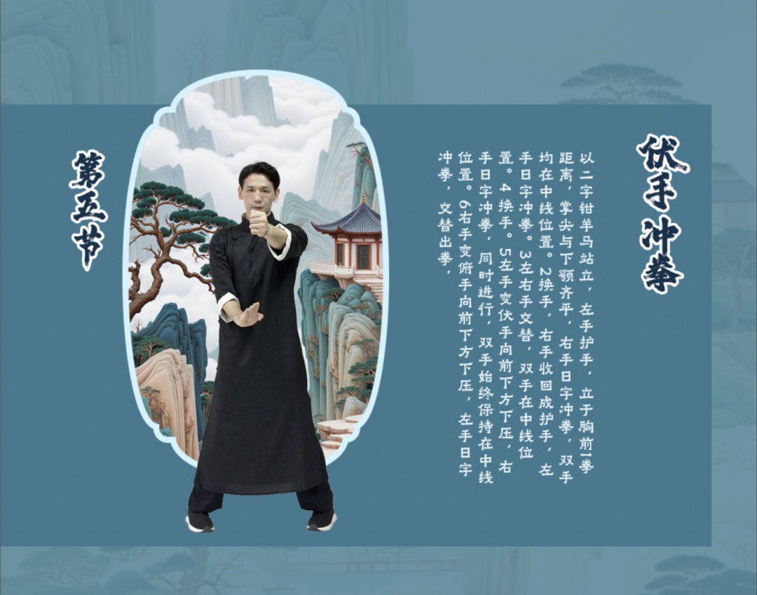 “伏手沖拳”的精妙之處,在于它要求雙手如“左手畫圓、右手畫方”般同步運(yùn)作、各行其是: 一手以伏手劃出圓融的弧線,有效阻擋、化解來(lái)力;另一手則同步擊出剛直的沖拳,直指目標(biāo)。這種一心二用、攻防同期的獨(dú)特協(xié)調(diào),不僅瞬間化解威脅,更能無(wú)縫銜接反擊,完美詮釋了詠春“連消帶打”的攻防一體精髓。