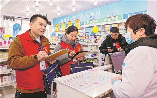 1月1日,山東省棗莊市市中區(qū)光明路街道普查員在一家連鎖藥店登記普查信息。