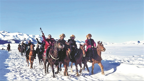 壯闊靜謐的雪原上,一場別具哈薩克族風(fēng)情的“刁羊”表演正在上演。20多匹駿馬踏雪而來,揚(yáng)起層層雪浪,引來游客陣陣驚嘆。