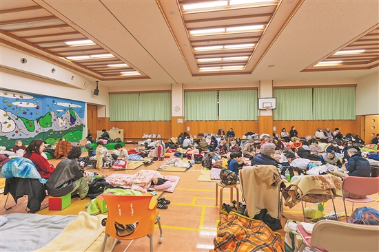 當(dāng)?shù)貢r間1月3日,人們在日本石川縣輪島市一處容納超700人的臨時避難所內(nèi)休息。新華社記者 張笑宇 攝