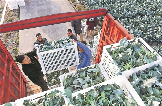 1月3日,在浙江省寧海縣胡陳鄉(xiāng)海航家庭農(nóng)場,來自四川涼山彝族自治州的務(wù)工人員將采收的西蘭花裝車。近期,浙江省寧??h11000多畝西蘭花進入收獲期,田間地頭一派忙碌景象。