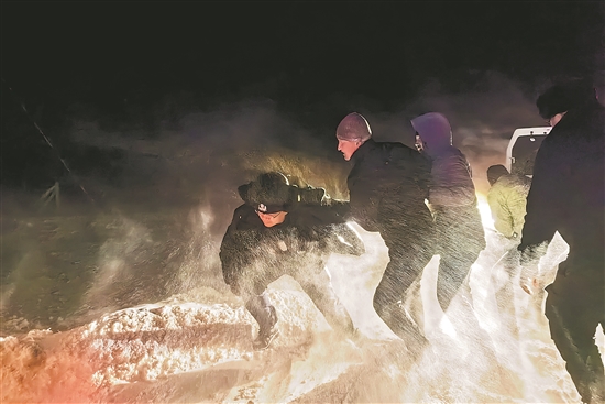 1月2日21時(shí)許, 新疆出入境邊防檢查總站阿勒泰邊境管理支隊(duì)加郎阿什邊境派出所民警同群眾一起,在風(fēng)雪中解救被困車輛和人員。王友波 攝