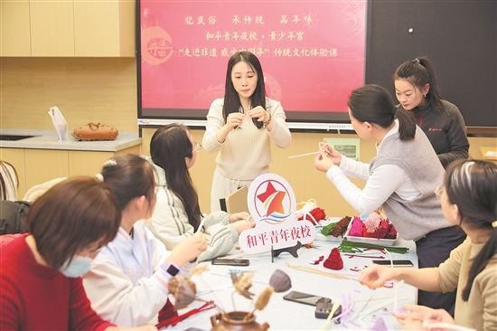 1月3日晚上,天津市和平區(qū)青少年宮,剛剛下班的青年職工正在學(xué)習(xí)絨花制作。