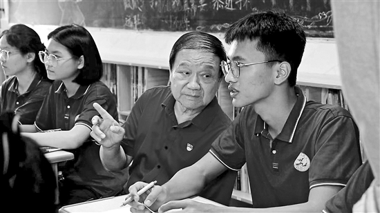 張東海(中)在萬(wàn)寧中學(xué)高二年級(jí)十二班的數(shù)學(xué)課上一邊聽(tīng)課一邊與學(xué)生交流。本報(bào)記者 賴書聞 攝