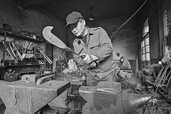 2023年12月7日,藍(lán)炳忠在鐵匠鋪里打制一把鐮刀。