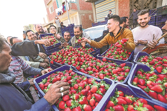 當(dāng)?shù)貢r(shí)間1月6日,人們?cè)诎<吧w勒尤卜省的一處市場購買新鮮草莓。當(dāng)下,埃及進(jìn)入草莓收獲上市的季節(jié)。