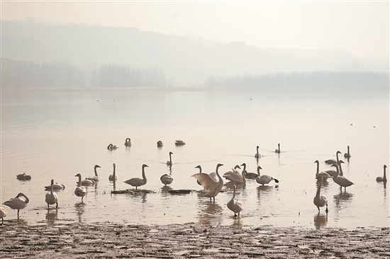 占地6000多公頃的山西平陸黃河濕地位于山西、河南兩省交界處,這里氣候溫和、采食豐富,非常適宜白天鵝越冬。每年秋末冬初,白天鵝就會(huì)成群結(jié)隊(duì)地從俄羅斯西伯利亞地區(qū)陸續(xù)飛臨這里越冬。