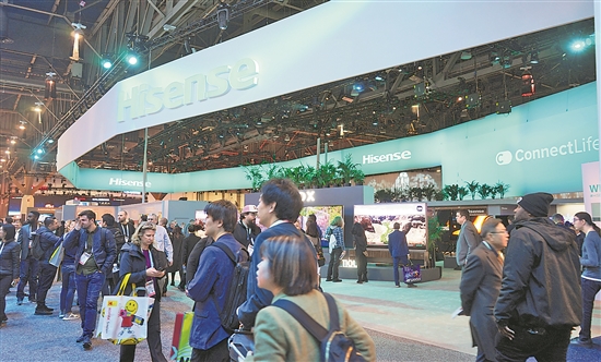 當?shù)貢r間1月9日,人們在美國拉斯維加斯消費電子展上參觀海信公司展臺。