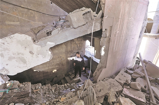 當?shù)貢r間1月10日,在加沙地帶南部城市拉法,一名巴勒斯坦人查看被以軍空襲后的住宅。
