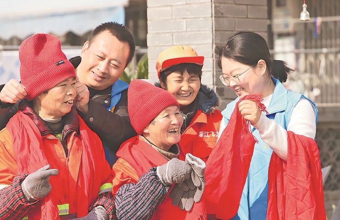 1月11日,浙江省臺州市路橋區(qū)螺洋街道總工會的干部為環(huán)衛(wèi)工人送上圍巾、棉帽、手套等御寒慰問品。連日來,螺洋街道總工會為寒冬里的環(huán)衛(wèi)工人、快遞小哥等送去保暖物品,傳遞工會組織的溫暖。本報通訊員 蔣友青 攝