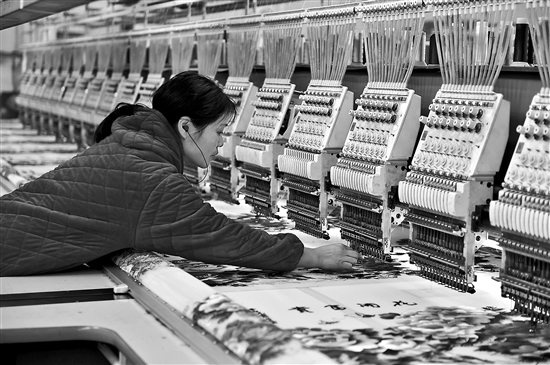 1月9日,汝州市汝繡產(chǎn)業(yè)園一家機繡企業(yè)的工人在生產(chǎn)車間內(nèi)作業(yè)。