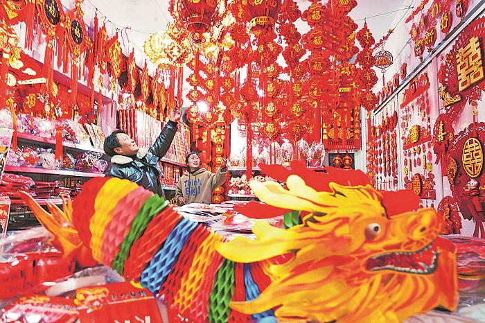 1?月?11?日,山西運城新絳縣,顧客在汾河灣小商品批發(fā)市場選購龍年年貨。隨著農(nóng)歷龍年春節(jié)臨近,各類年貨已爭先恐后搶“鮮”市場。本報通訊員 高新生 攝