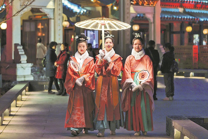 1 月 11 日,在江蘇南京牛首山文化旅游區(qū)金陵小城,3名景區(qū)工作人員身著古裝,在一片仿古建筑中漫游。小城曲徑通幽,以“一街、一水、一禪、一堂、一館、兩湖”為脈絡,通過移步易景的場景變化,生動再現(xiàn)游宴雅集、名士風雅的千年金陵風華。本報記者 吳凡 攝