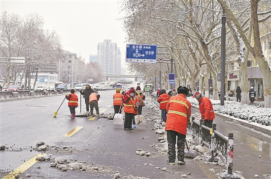 1月15日,受冷空氣影響,河南省部分地區(qū)迎來降雪。1月16日,環(huán)衛(wèi)工人在鄭州市花園路清理積雪。