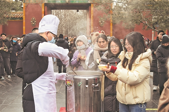 1月18日,農(nóng)歷臘月初八,是中國傳統(tǒng)“臘八節(jié)”,喝臘八粥是臘八節(jié)的重要習(xí)俗。北京雍和宮舉辦“舍粥”活動(dòng),吸引眾多市民前來領(lǐng)取臘八粥。 本報(bào)記者 楊登峰 攝