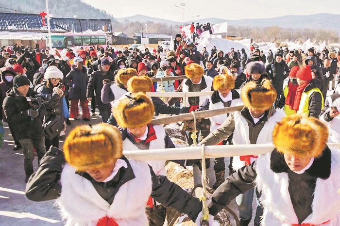 1月27日,吉林省安圖縣吉房子村,游客正與當(dāng)?shù)卮迕褚黄痼w驗(yàn)民俗活動(dòng),感受“森林號(hào)子”這一國(guó)家級(jí)非物質(zhì)文化遺產(chǎn)的魅力,迎接即將到來(lái)的新春佳節(jié)。
