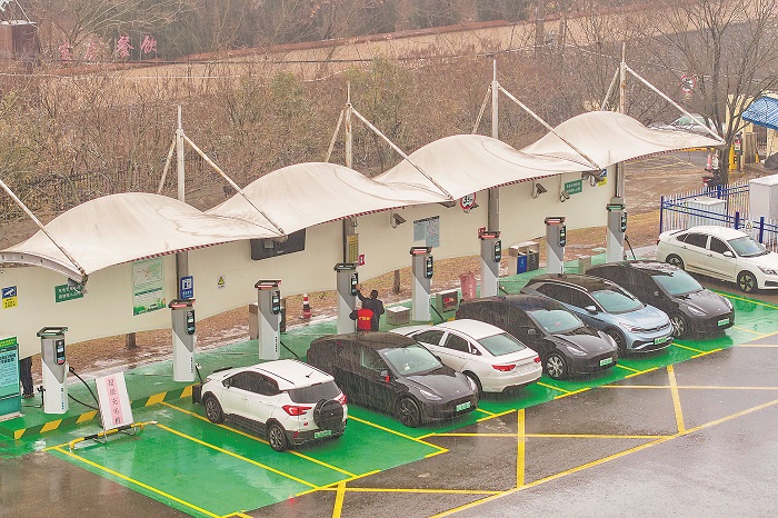 圖為江蘇省滬蓉高速黃栗墅高速服務(wù)區(qū)充電站。預(yù)計(jì)春節(jié)期間,江蘇省高速公路服務(wù)區(qū)充電量將達(dá)到400萬(wàn)千瓦時(shí),同比增長(zhǎng)150%。本報(bào)記者 劉金夢(mèng) 攝