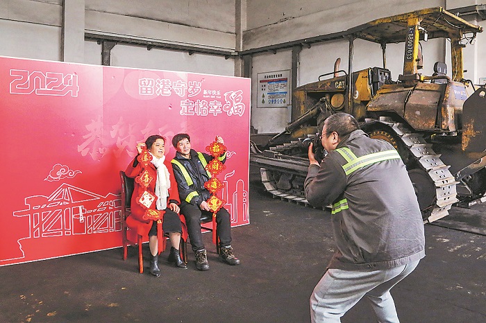 1月31日,吳水花穿上新買的大紅衣服坐上了開(kāi)往寧波舟山港股份有限公司北侖礦石碼頭分公司寧鋼碼頭的專車。她丈夫陳必生是該碼頭裝卸工,這天公司舉辦“留港守歲,定格幸?!被顒?dòng),為春節(jié)留守的職工拍攝全家福。蔣曉東 宋子琦 攝