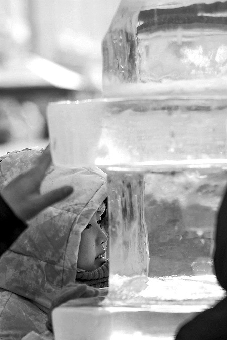 一位小朋友在與兆麟公園的冰雕“親密接觸”。楊銳 攝