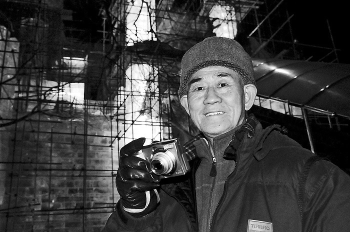 王景富生前采訪冰燈建設(shè)時的留影。受訪者供圖