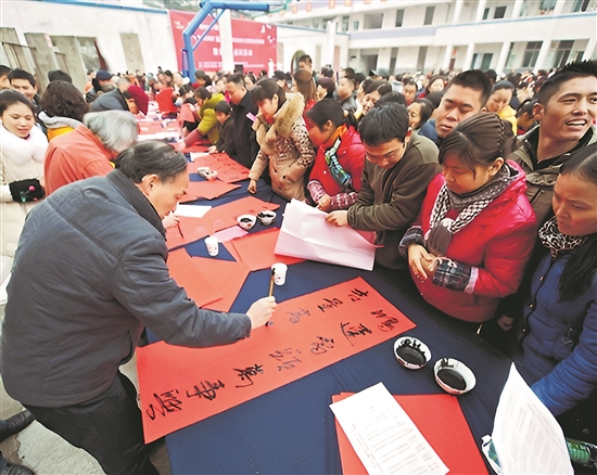 2015年1月11日上午,由中國(guó)書(shū)法家協(xié)會(huì)發(fā)起,四川省書(shū)法家協(xié)會(huì)聯(lián)合華西都市報(bào)、資陽(yáng)市委宣傳部、資陽(yáng)市文聯(lián)主辦的“我們的中國(guó)夢(mèng)——中國(guó)書(shū)法家‘送萬(wàn)福、進(jìn)萬(wàn)家’公益活動(dòng)”啟動(dòng)儀式在四川省資陽(yáng)市所屬簡(jiǎn)陽(yáng)市賈家鎮(zhèn)舉行。