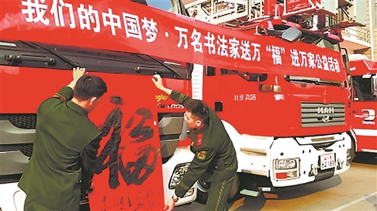 2015年春節(jié)前夕,中國(guó)書(shū)法家協(xié)會(huì)組織在京的主席團(tuán)成員及部分理事,到北京市朝陽(yáng)區(qū)公安消防奧林匹克公園中隊(duì)慰問(wèn)。張海、陳洪武、蘇士澍等近20位書(shū)法家為戰(zhàn)斗在一線的消防員們現(xiàn)場(chǎng)書(shū)寫(xiě)“?!弊趾痛郝?lián)。
