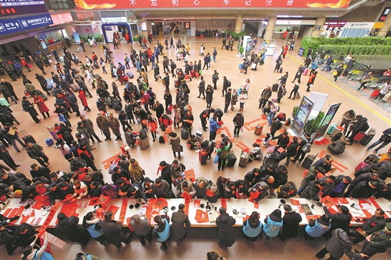 2015年春節(jié)前夕,一批特殊的溫暖小分隊(duì)帶著筆墨紙硯出發(fā)了。他們當(dāng)中有中國(guó)書(shū)法家協(xié)會(huì)的主席、副主席,有廣大職工群眾耳熟能詳?shù)闹麜?shū)法家。他們走進(jìn)火車站候車大廳,擺上桌案、鋪開(kāi)宣紙,黑色的筆墨在火紅的宣紙上游走,氣勢(shì)恢宏的“?!弊帧⒊錆M童趣的“?!弊謶?yīng)運(yùn)而生。