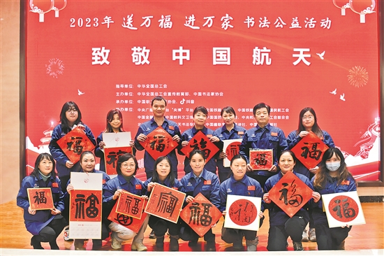 2023年1月15日,由全國(guó)總工會(huì)指導(dǎo),全國(guó)總工會(huì)宣傳教育部、中國(guó)書(shū)法家協(xié)會(huì)主辦的2023年“送萬(wàn)福、進(jìn)萬(wàn)家”書(shū)法公益活動(dòng)走進(jìn)中國(guó)航天,為廣大航天人送上新年祝福。