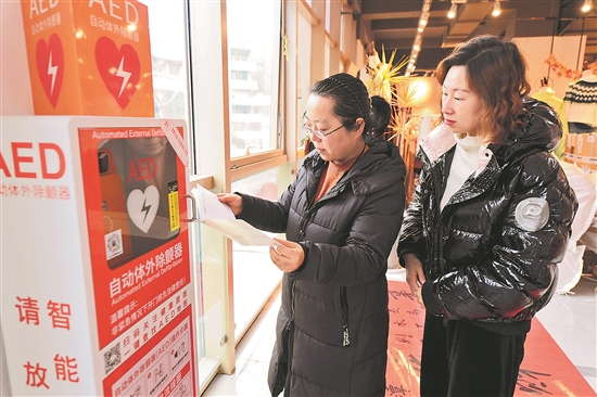 近日,建德市衛(wèi)健局工作人員(左)在商場(chǎng)內(nèi)查看AED設(shè)備維護(hù)記錄。