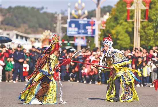 2月18日,人們在貴州省龍里縣民俗踩街活動中表演太平花燈戲。