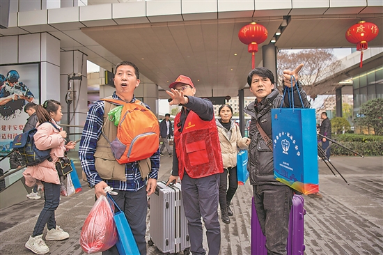 2月18日,浙江省鐵路金華站廣場上,金華市總工會和市人社局組織的志愿者引導來自貴州黔南州的返崗務(wù)工人員乘車分赴各市區(qū)縣企業(yè)。這是金華市今春首班返崗專列。為保障企業(yè)用工穩(wěn)就業(yè),2023年11月開始,金華市就派出工作組分別走訪在金勞動力密集省份,提前謀劃對接春節(jié)前后返崗保障、用工服務(wù)、勞務(wù)合作等事項。本報通訊員 胡肖飛 攝