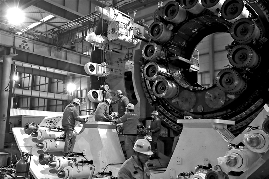 2月19日,河南鄭州,中國(guó)中鐵工程裝備集團(tuán)有限公司的車間,盾構(gòu)機(jī)裝配工人正在調(diào)試一臺(tái)即將出口的盾構(gòu)機(jī)。