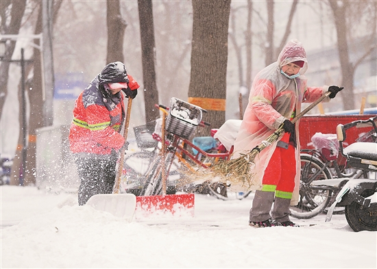 2月20日,環(huán)衛(wèi)工人在河北省石家莊市中山路清掃積雪。