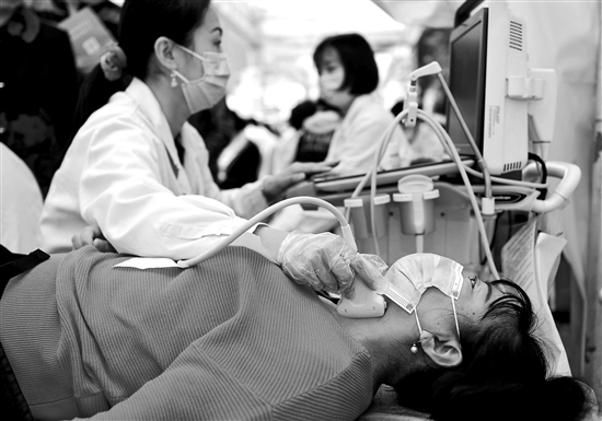 在重慶,一次義診中,醫(yī)護人員正在為一位市民進行甲狀腺癌篩查。周毅 攝/中新社