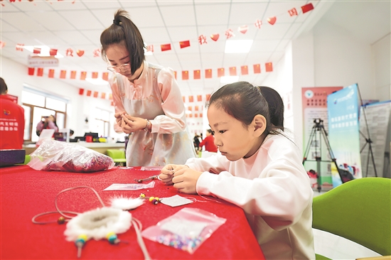 2月19日,內(nèi)蒙古自治區(qū)呼倫貝爾市東山街道遠山社區(qū)黨群服務中心,社區(qū)兒童在老師的指導下制作“非遺”太陽花。本報記者 蔚可任 攝