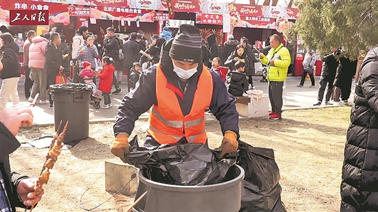 今年春節(jié),北京地壇廟會(huì)闊別四年回歸,人氣爆棚,開幕首日就迎來超13萬人次的客流量。為了給游客提供一個(gè)干凈整潔的游園環(huán)境,讓大家舒心愉悅地品年味、賞民俗,地壇公園共有105名保潔人員負(fù)責(zé)清掃,日均清理垃圾超13噸。他們每天早上6點(diǎn)半到崗,等到晚上七八點(diǎn)把所有垃圾清運(yùn)裝車運(yùn)走后才能休息。(本報(bào)記者 曲欣悅)