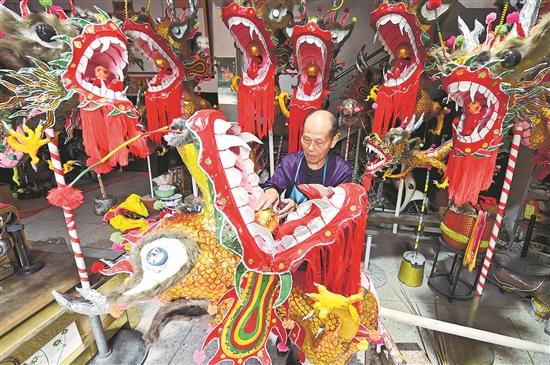 2月20日晚,廣西南寧市賓陽縣舉行2024年炮龍節(jié)百龍舞賓州活動,超過100條炮龍在震耳欲聾的鞭炮聲、鑼鼓聲和歡呼聲中起舞。賓陽炮龍節(jié)是當(dāng)?shù)貪h、壯民族文化融合的民間節(jié)慶,至今已有千年歷史。目前,賓陽縣有炮龍扎制藝人近20人。扎制炮龍是一個耗費大量時間和精力的手工活,僅龍頭就有1000多個捆綁點,一條炮龍往往需要多人合作半個月才能完成扎制。圖為炮龍扎制藝人鄒玉特在扎制炮龍。 新華社記者 陸波岸 攝