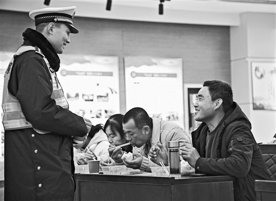 2月21日,在陜西交控集團(tuán)銅川新區(qū)管理所暖冬服務(wù)臨時(shí)休息室,等待高速通行的貨車司機(jī)正在享用免費(fèi)餐食。20日起,陜西省銅川市迎來(lái)一輪雨雪冰凍天氣,當(dāng)?shù)叵嚓P(guān)部門與市民、志愿者多方合力,積極應(yīng)對(duì),保障群眾生活安全有序。新華社記者 張博文 攝