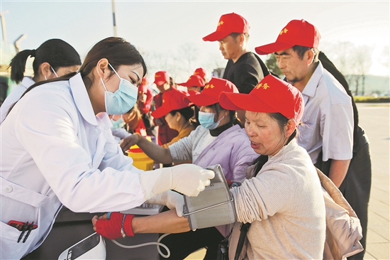 近日,云南曲靖北站站前廣場,醫(yī)護(hù)人員為外出務(wù)工人員測量血壓和提供健康咨詢。當(dāng)日,曲靖市組織春節(jié)后農(nóng)村勞動力轉(zhuǎn)移就業(yè)集中歡送儀式,為千余名農(nóng)民工提供專列“點對點”輸出服務(wù)。近年來,當(dāng)?shù)夭扇 包c對點”“一站式”全程保障服務(wù)措施,讓務(wù)工人員實現(xiàn)“出家門、上車門、進(jìn)廠門”無縫銜接,確保外出務(wù)工人員安全、有序返崗。楊俊鵬 攝/視覺中國