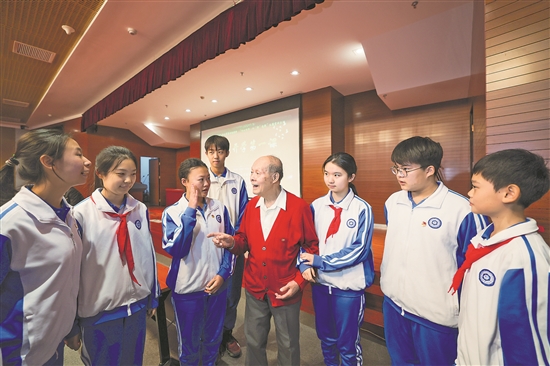 2月26日,在天津市第四中學(xué),91歲的新中國(guó)第一代飛行員周修平與學(xué)生們交流。