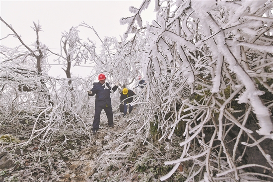 連日來,受冷空氣影響,廣西桂北高寒山區(qū)出現(xiàn)低溫雨雪冰凍天氣,導致電力線路覆冰,當?shù)貑拥蜏赜暄┍鶅鰹暮Β蠹墤表憫?。新華社記者 黃孝邦 攝