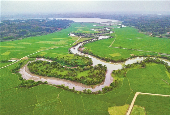 圖為2月26日在??谑协偵絽^(qū)拍攝的三十六曲溪及周邊的早稻田(無人機照片)。